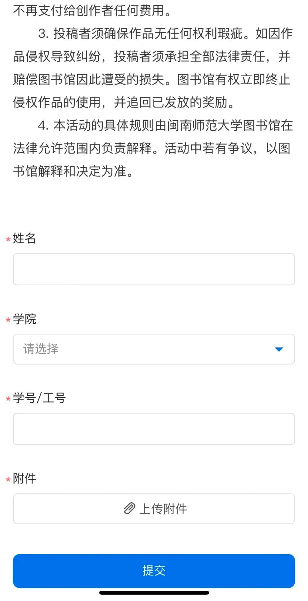 3. 投稿者须确保作品无任何权利瑕疵。如因作品侵权导致纠纷,投稿者须承担全部法律责任,并赔偿图书馆因此遭受的损失。图书馆有权立即终止侵权作品的使用,并追回已发放的奖励。