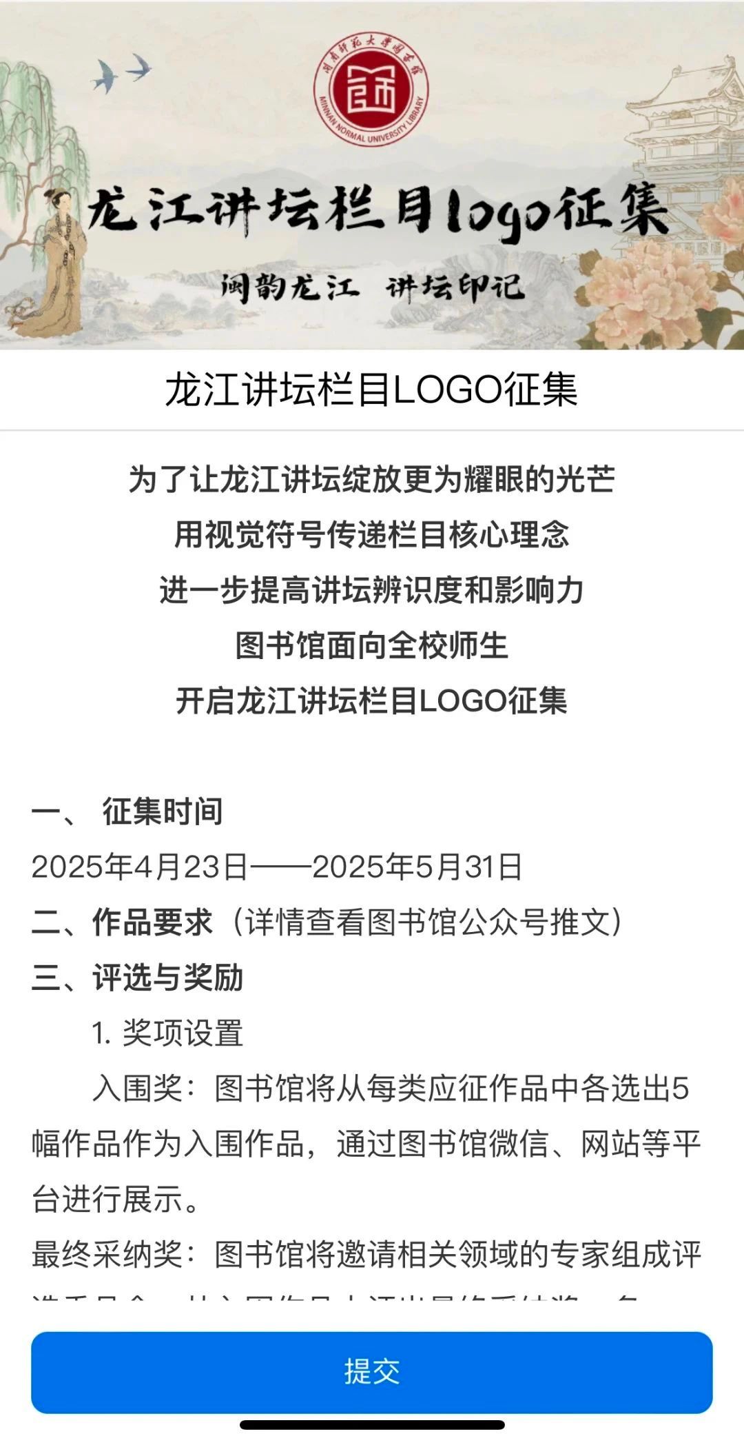 为了让龙江讲坛绽放更为耀眼的光芒,用视觉符号传递栏目核心理念,进一步提高讲坛辨识度和影响力,图书馆面向全校师生征集龙江讲坛LOGO的设计方案!欢迎充满热忱、才华横溢的你,用画笔和心中的奇思妙想,雕琢出完美诠释龙江讲坛魅力的LOGO作品!