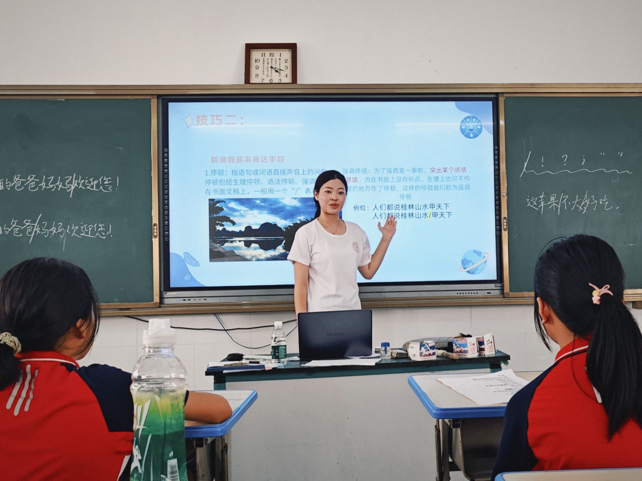 朗诵组的实践队员们向小营员们介绍了朗诵的基本知识,通过有趣的口部操、气息操,让小营员们掌握发音、语调、节奏和停顿,通过具体文章的分析,引导他们深入理解文本内涵,感受语言的韵律之美。在学习过程中,孩子们表现出了浓厚的兴趣,他们认真聆听、积极练习,并不断尝试将所学技巧运用到实际的朗诵中。