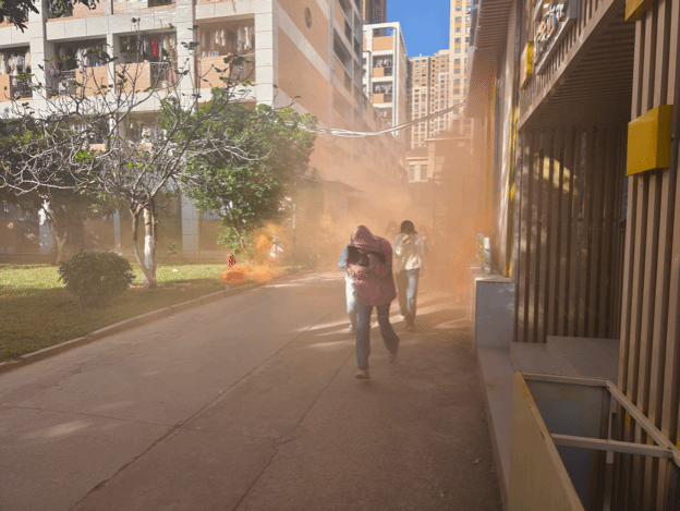为确保活动顺利进行,演练开始前,保卫处工作人员进行防震减灾应急科普知识宣讲,向学生宣传教育防灾减灾的相关知识,确保每位学生都能掌握正确的避险地点和逃生姿势。随着警报声响起,参与消防演练的同学们在工作人员的指导下,弯腰捂鼻,迅速有序地按照消防疏散示意图及路线疏散至聚誉门口喷泉前空地。