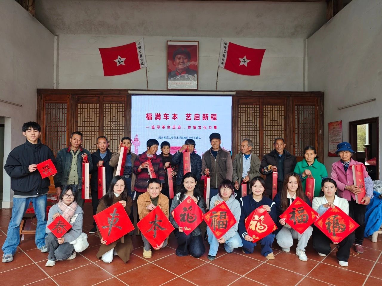 2025 年 1 月 22 日,金年会jinnianhuicom师生走进漳浦县石榴镇车本村,开展了一场以“福满车本,艺启新程——追寻革命足迹,体悟文化力量”为主题的新春实践活动。此次社会实践恰逢春节前夕,金年会jinnianhuicom结合学院专业特色,深入作为福建革命老区、有“闽南井冈山”之称的车本村,为革命老区村民送去新春的祝福,同时深入追寻领袖足迹,弘扬中华优秀传统文化,传承红色血脉,共同助力乡村振兴。