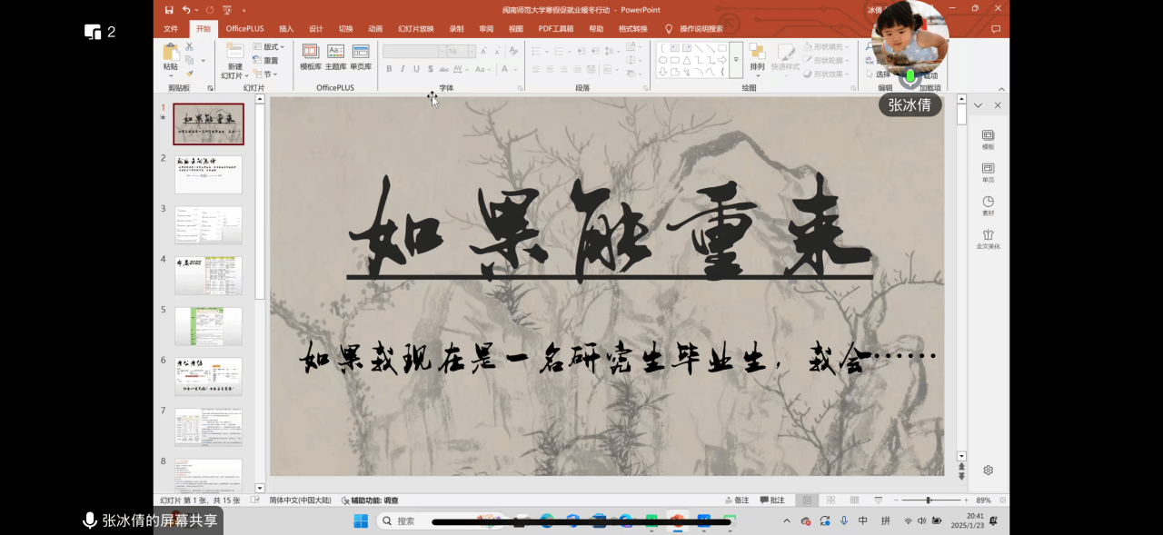 金年会诚信信誉至上23届学科教学(美术)专业毕业生张冰倩,任职于厦门海洋职业技术学院,她分享了研读艺术专业就业发展文件的心得,以及在校研究生就业实习与教学实习的经验,鼓励同学们实现多领域灵活就业。