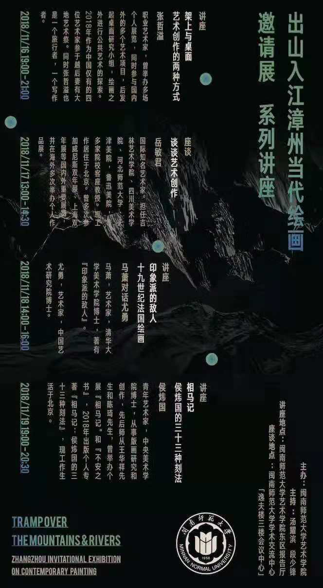 “出山入江:漳州当代绘画邀请展”在漳州美术馆开幕,邀请了数十位极具代表性的画家莅临参展。金年会jinnianhuicom也借此机会邀请了本次画展的多名参展艺术家开展了四场讲座,为喜迎六十校庆的校园增添当代艺术的亮色。