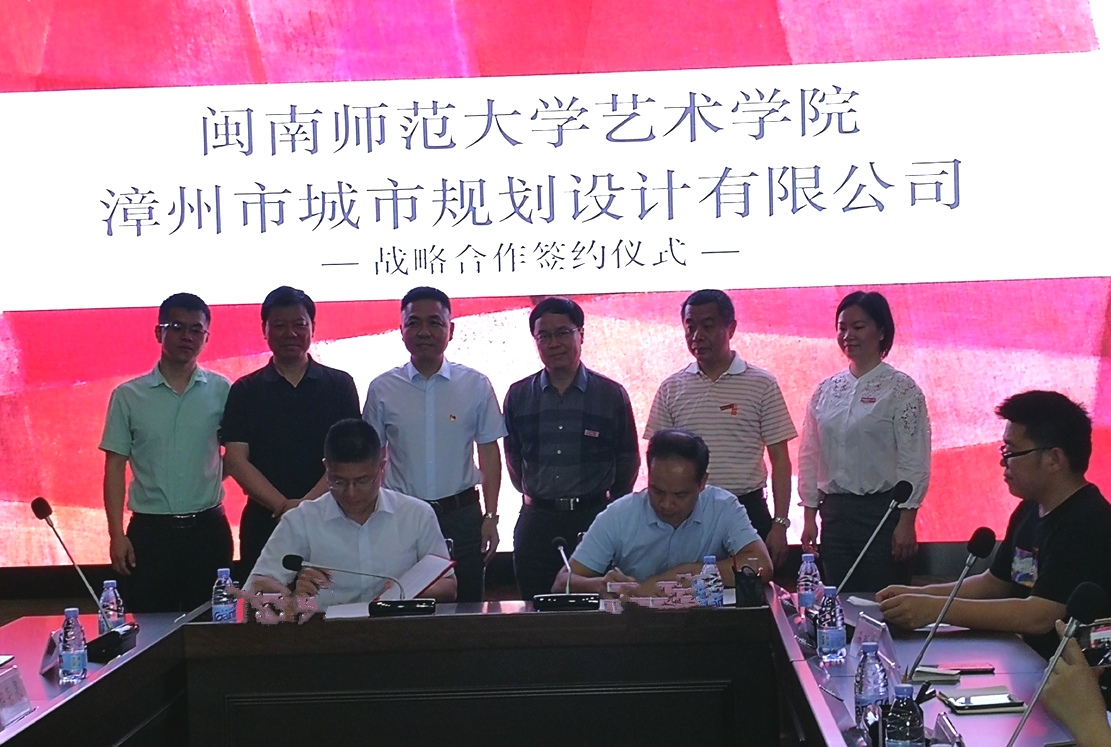 我校金年会jinnianhuicom美术与设计系主任朱三益与漳州市城投设计咨询集团规划设计院院长郑荣泉代表双方签订《金年会诚信信誉至上与漳州市城市规划设计有限公司战略合作框架协议》。根据协议,双方将在项目编制、课题申报等方面展开合作,并将研究成果作为双方共享的知识产权;我校相关专业教师可参与漳州市城市规划设计有限公司项目论证,漳州市城市规划设计有限公司将派专人对我校师生的项目进行指导,并提供师资方面的支持。