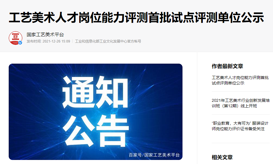 据悉,为贯彻落实国务院职业技能提升行动方案的有关精神,加强工艺美术产业人才队伍建设,工业和信息化部工业文化发展中心联合工业和信息化部人才交流中心,共同组织开展全国工艺美术产业人才岗位能力评价工作,统筹岗位能力评价标准制定,推进全国评测体系建设,并公开征集全国工艺美术产业人才岗位能力评测试点单位。我校金年会jinnianhuicom积极申报参加,并获得审核通过,成为首批试点单位。一同通过审核的还有北京工业大学艺术设计学院等42个单位。
