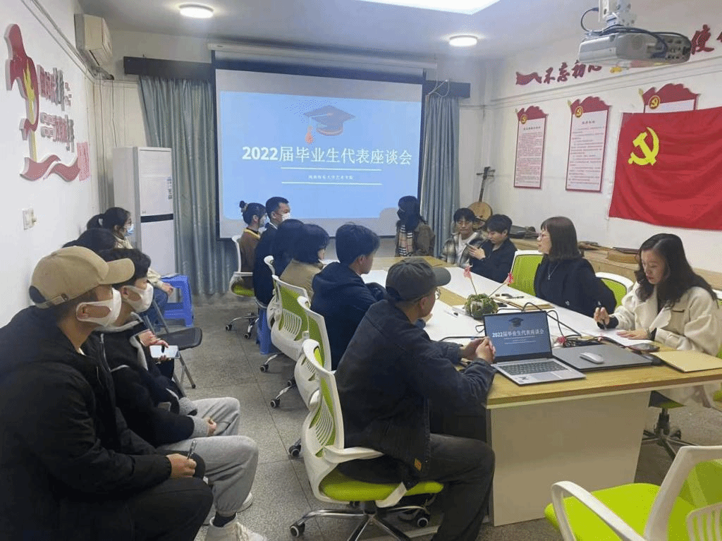 座谈会上,毕业生代表依次发言,就在校期间学习、生活上需要改进的地方,向学院提出了意见和建议。胡老师与同学们亲切交谈,她和同学们在学习场地与管理、学校基础设施的建设与完善、职业规划等方面进行了深入交流。
