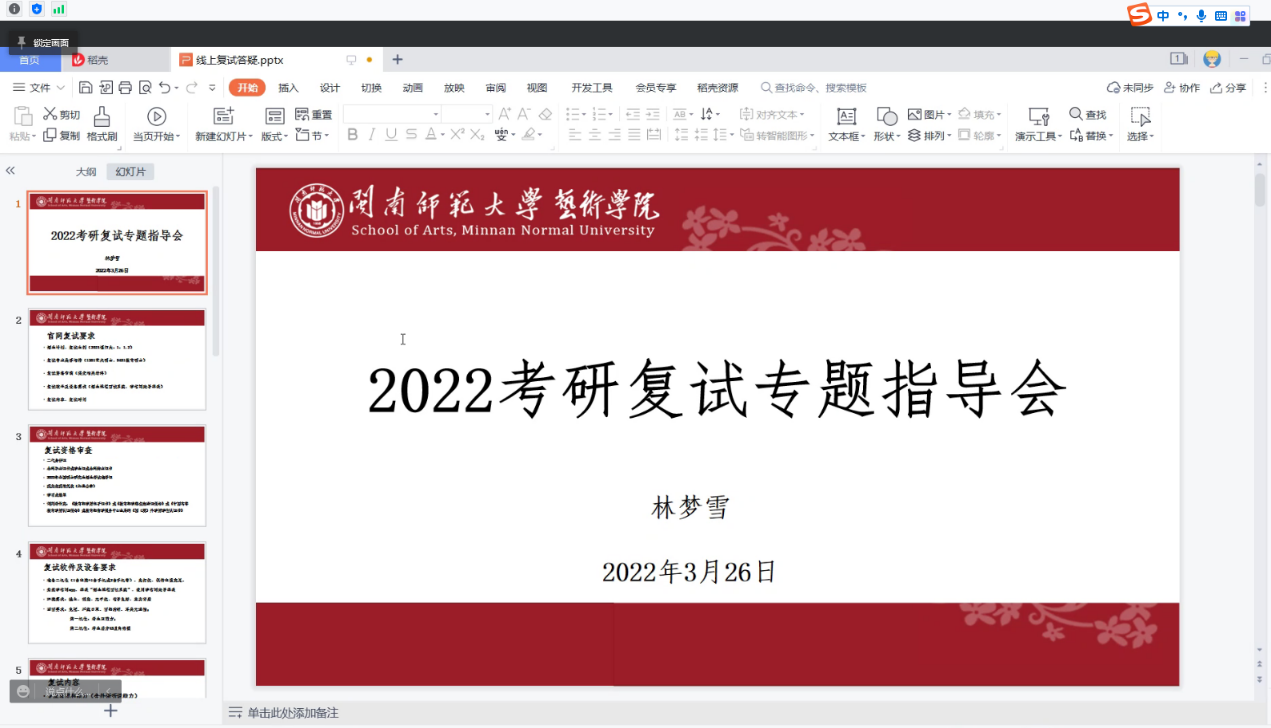 讲座伊始,林梦雪老师为同学们介绍了一志愿学校的招生比例和复试要求,以及资格审查需要提交的相关材料。近年疫情导致多校为线上复试,林老师分析了线上复试的技巧和双机位的摆放。从复试的内容准备、调剂的策略等方面进行了耐心细致的指导。会议最后,林老师还对同学们就有关复试与调剂的提问进行了详细的解答,对于复试感到紧张的同学,林老师给出了相关的安抚和建议,并强调在复试过程中要积极回应老师的问题,性格开朗,有礼貌是通过复试的关键。