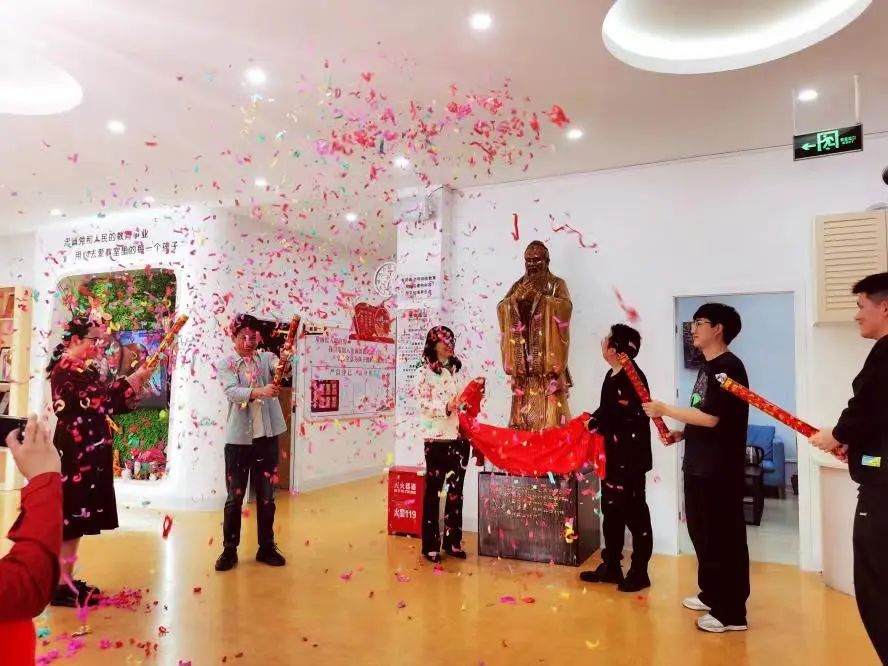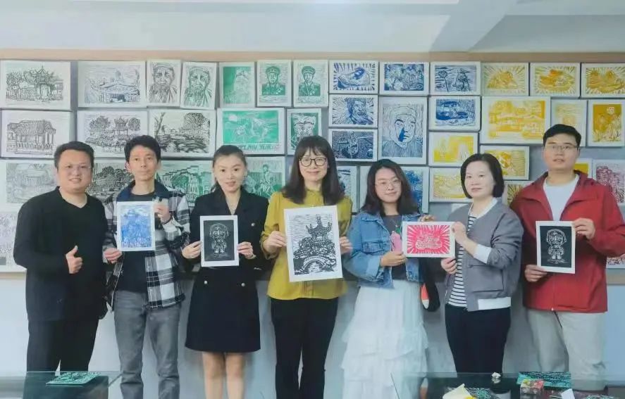 老师们在谢文旺老师的带领下,参观了参观了童画馆未来美学(高段校区),一同进行学术交流,一同体验版画绘制。座谈会上,谢文旺老师表达了对母校悉心培养的感恩之情,感谢学院长久以来对他创业以及以及成长路上的关怀和帮助,并表示将持续支持学院的建设与发展。座谈结束后,双方共同见证童画馆至圣先师孔夫子像的揭幕仪式。