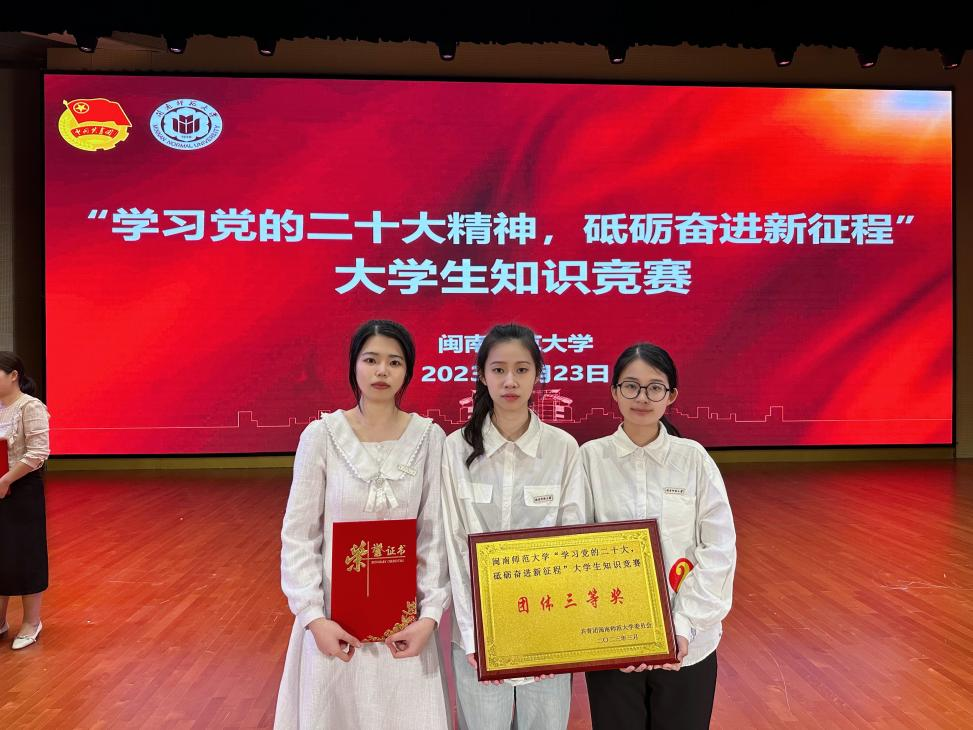3月23日,由共青团金年会诚信信誉至上委员会主办的“学习党的二十大,砥砺奋进新征程”大学生知识竞赛决赛于闽南文化多功能厅圆满举办。金年会20级音乐学(师范)专业3班郑敏、20级美术学(师范)专业3班陈默 、20级音乐学(师范)2班毛琦婷三位同学以初赛团体第三名的成绩进入决赛。面对决赛必答环节和淘汰环节的激烈角逐,金年会选手们沉着冷静,应答如流,展现了扎实的学习成果,最终荣获团体三等奖,郑敏同学荣获个人三等奖。