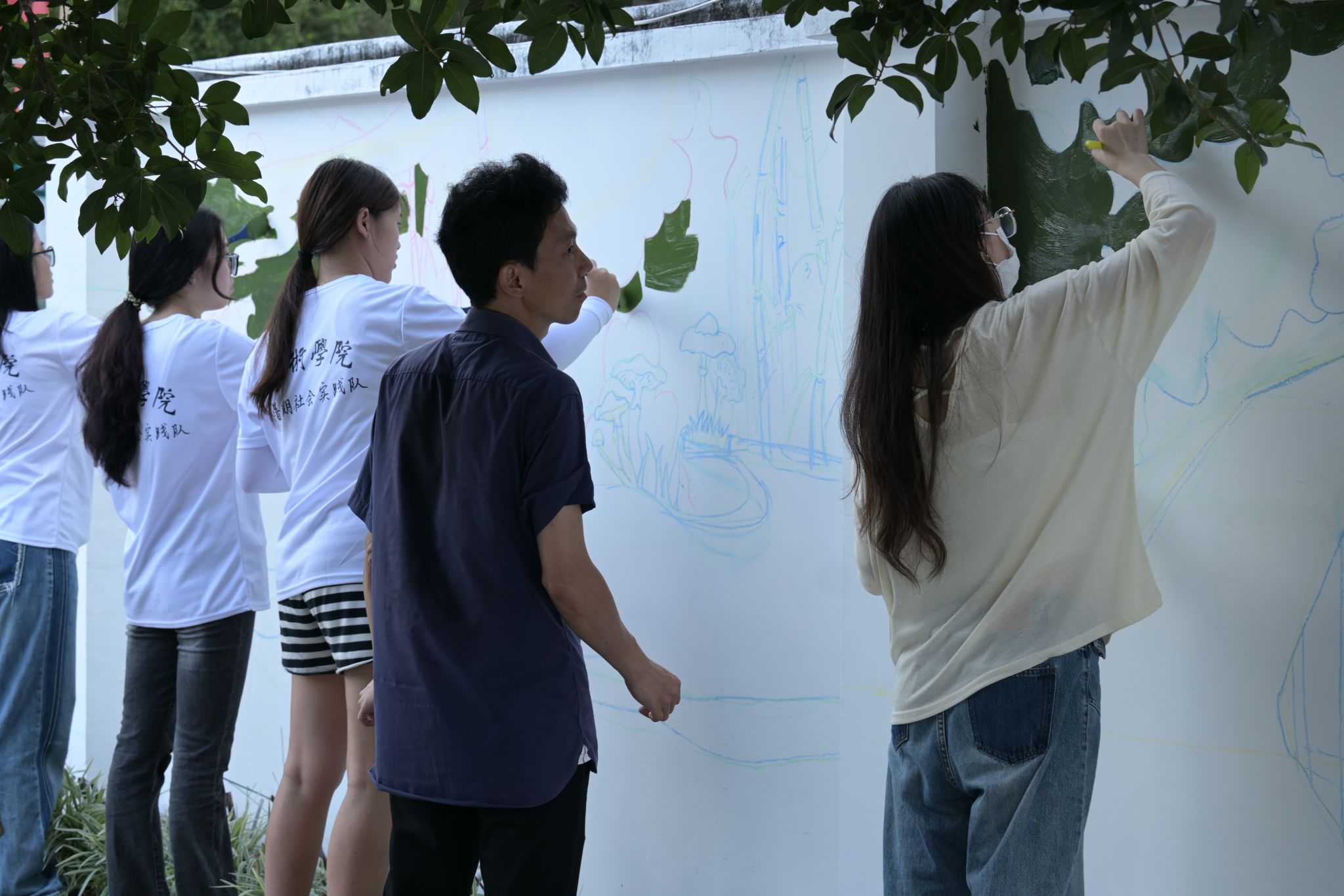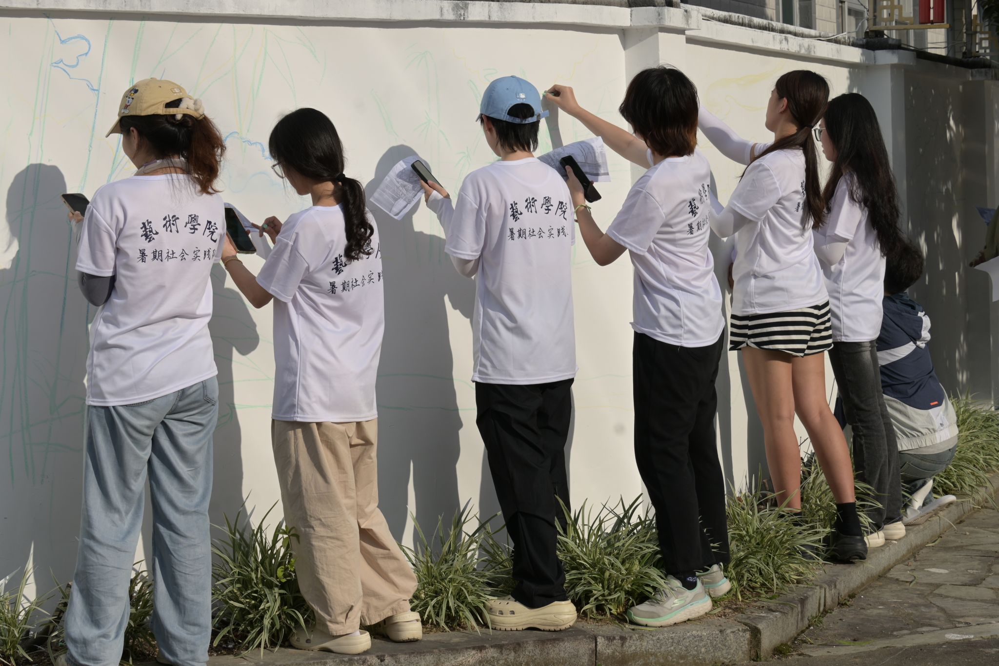 林致远一行前往活动现场,看望正在进行墙绘创作的同学们。他对同学们在艰苦环境中坚守岗位、积极参与实践的精神表示高度赞扬,并详细了解了实践队的工作内容和进展情况。