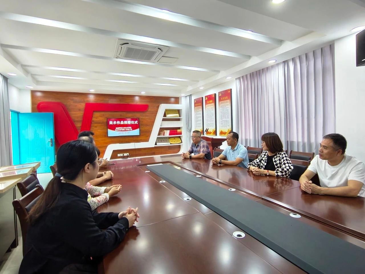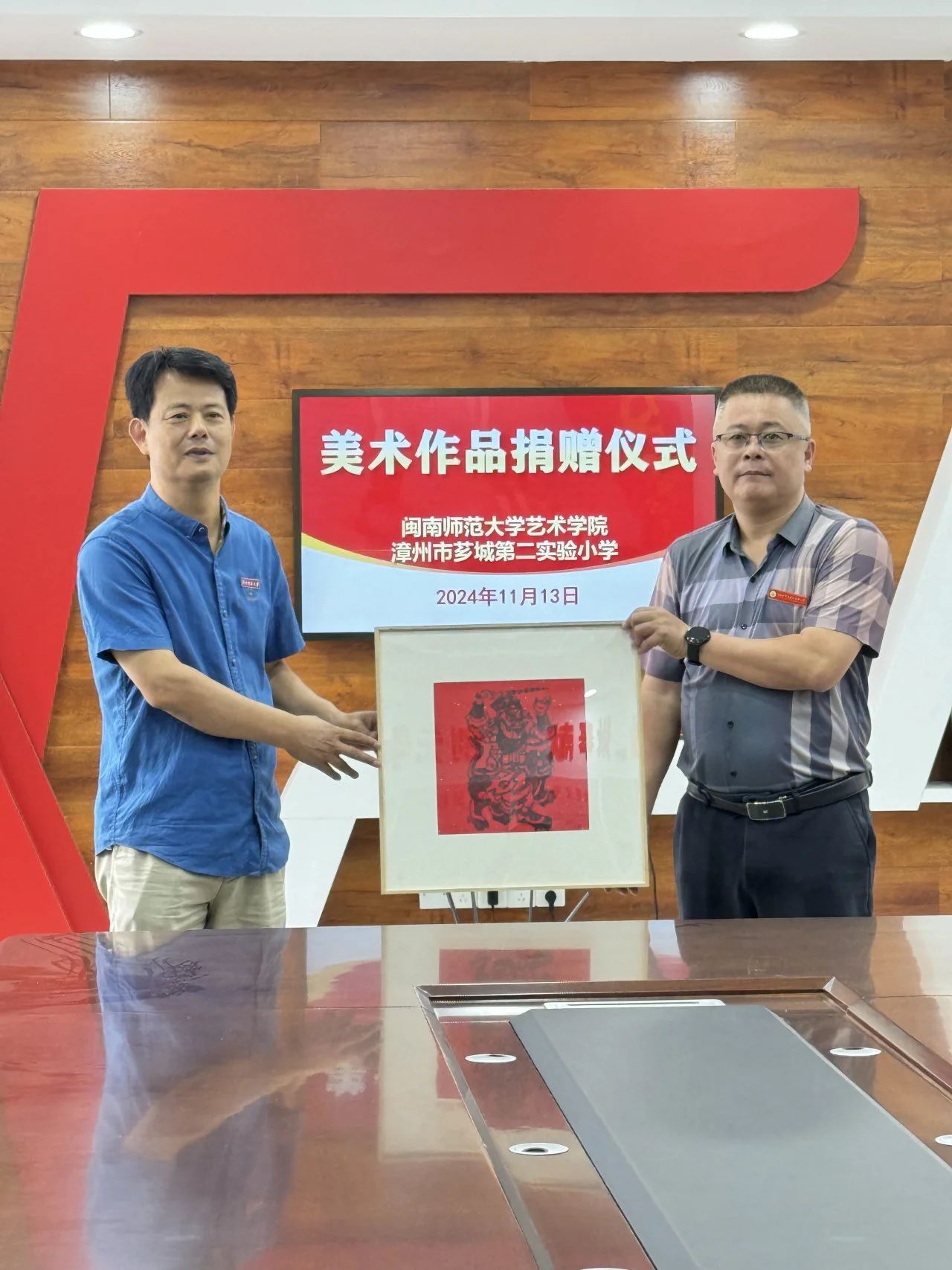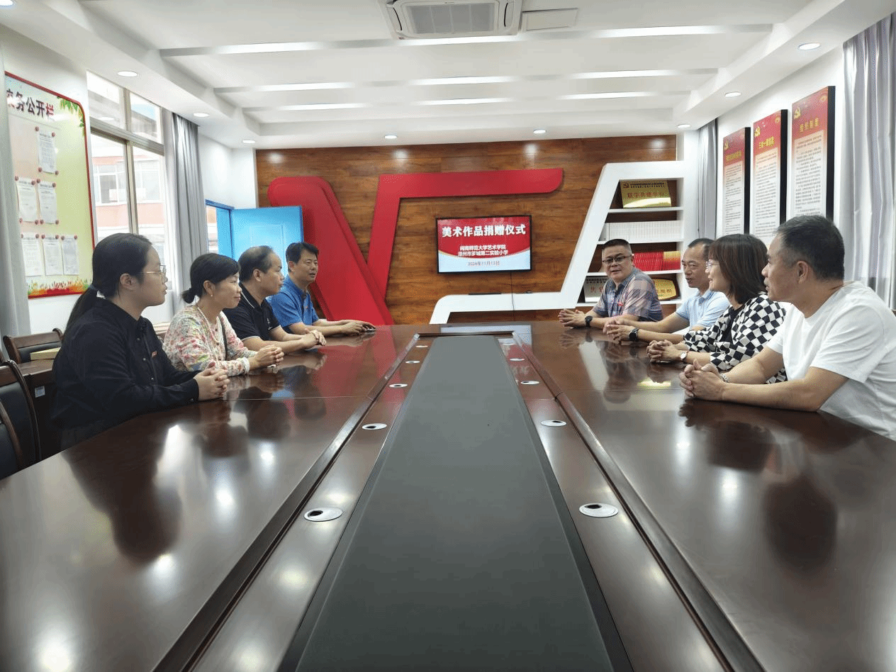 11月13日上午,金年会jinnianhuicom向漳州市芗城第二实验小学美术作品捐赠仪式在漳州市芗城二小党员会议室举行,漳州市芗城第二实验小学党委书记、校长沈毅强,副书记、副校长林英发,金年会jinnianhuicom副院长蓝达文、美术与设计系系主任朱三益,以及双方教师代表出席捐赠仪式。