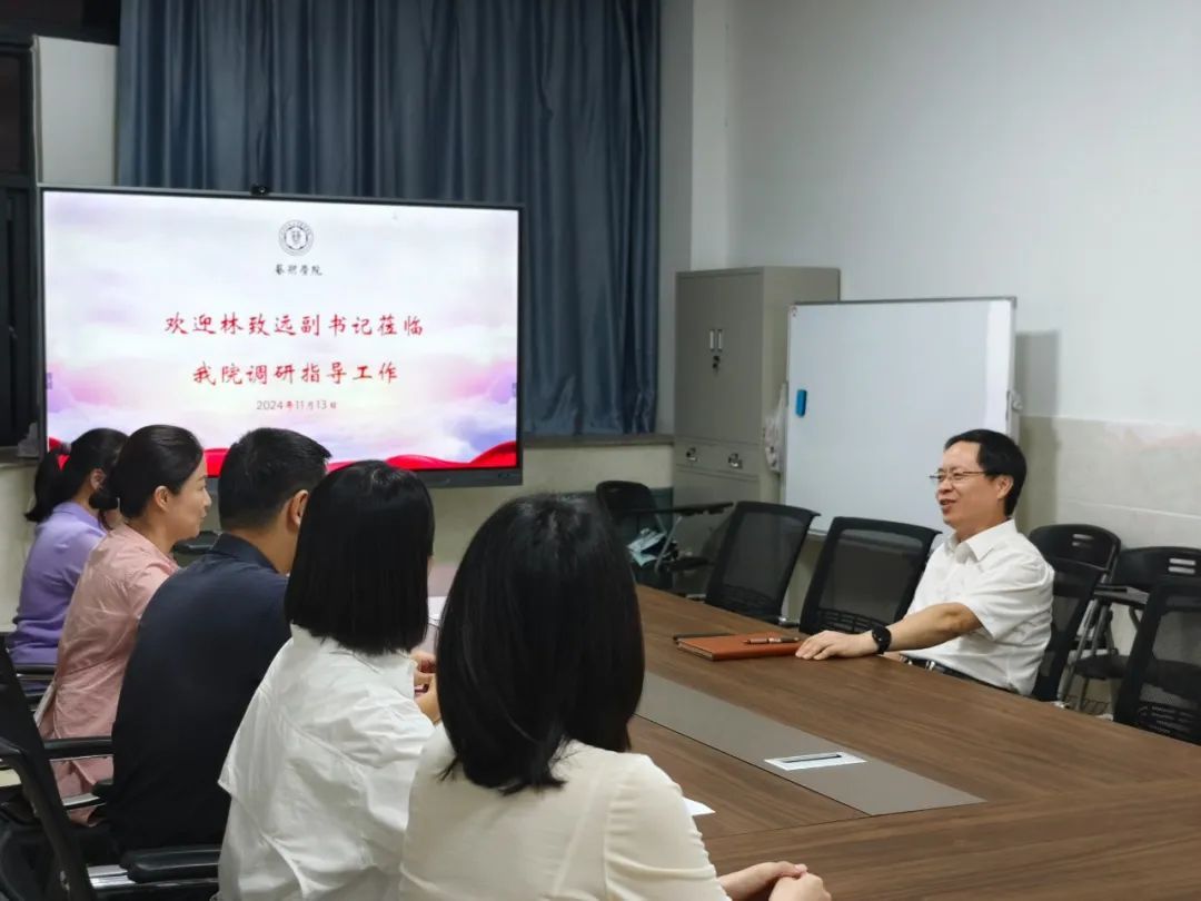 2024年11月13日,校党委副书记林致远到金年会jinnianhuicom学习宣传贯彻习近平总书记在福建考察时的重要讲话精神,并调研党建工作、全面从严治党、学科发展、专业建设、人才培养、师资队伍建设、科研工作等方面情况。林副书记强调要进一步提高政治站位,深化思想认识,认真贯彻落实党中央决策部署,落实省委工作要求以及执行校党委决定,不断压实党建工作责任,认真履行全面从严治党第一责任和“一岗双责”,全力推动学院各项工作取得新成效,为加快推进学校省“双一流”建设添砖加瓦。