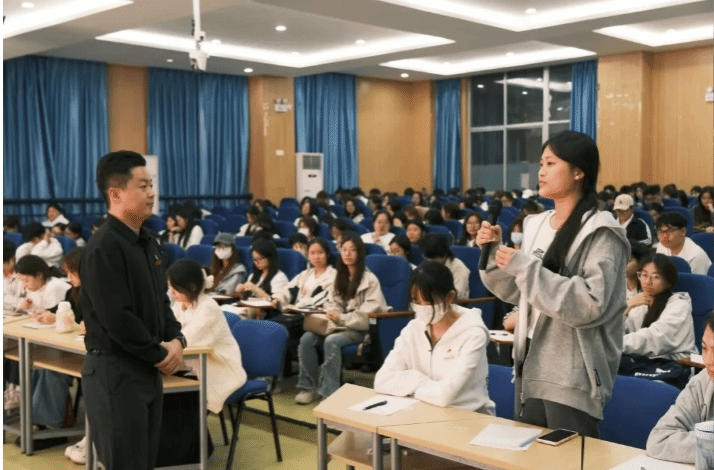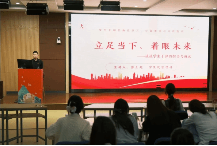 学生处管理科张士超老师以“你为什么选择当学生干部”为题,引导学员们思考自身所肩负的责任,随后从学生干部的角色意义、必备素养、实践指南、未来方向四个方面展开讲解,帮助学员们明晰了学生干部的职责,他指出青年要志存高远、脚踏实地,在学习、工作和生活中发挥模范带头作用。