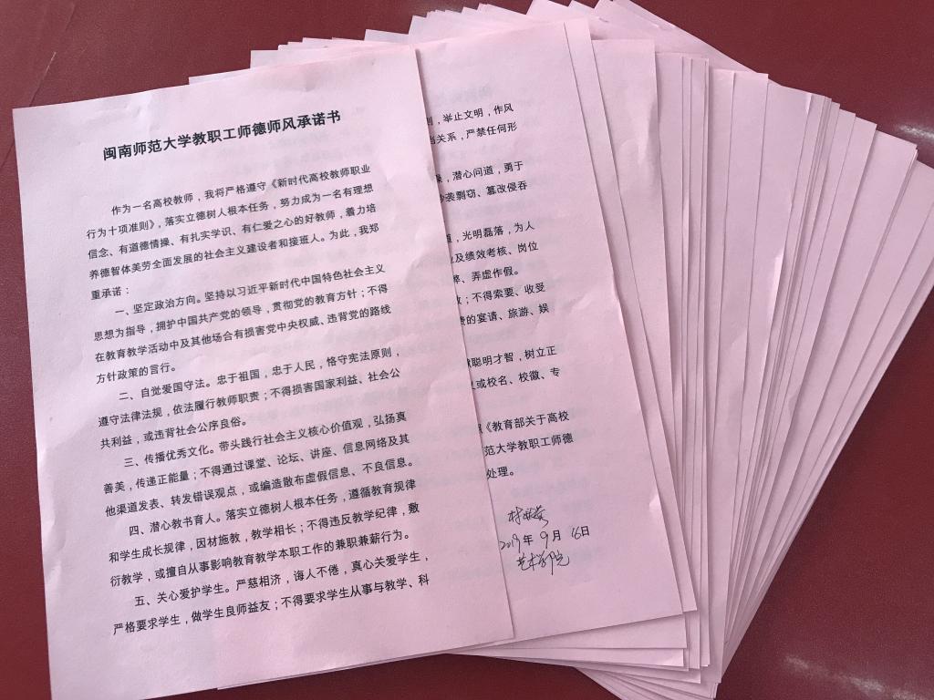为深入贯彻省教育厅和金年会诚信信誉至上关于进一步加强师德师风建设的有关文件精神,旨在通过强化师德、端正师风,进而落实立德树人根本任务,培养新时代“四有”好教师,9月16日下午,金年会在二楼会议室举行金年会jinnianhuicom教职工师德师风承诺书签署仪式。仪式由许佩晖副院长主持,学院党政领导及全体教职员工参加。