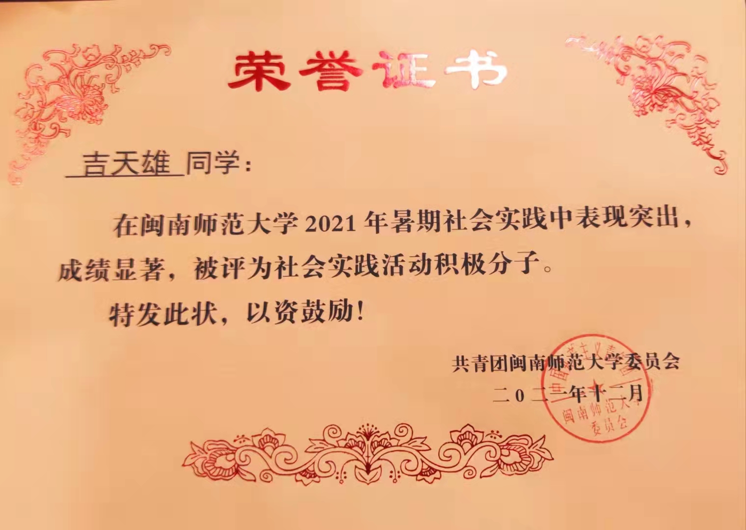 在这期间里,他获得了第十届福建省大学生“创业之星”,2021“大学生自强之星”推荐人选,通过了福建省科技厅第八批科技型中小企业认定,并获得2021全国第十届暨福建省第九届创新创业大赛省级优秀企业奖、福建省人社厅大中专毕业生创业省级资助项目优秀、福建省第九届创新创业大赛漳州市科技局决赛优秀项目、福建省漳州市2021大中专毕业生创业市级资助项目一等奖。