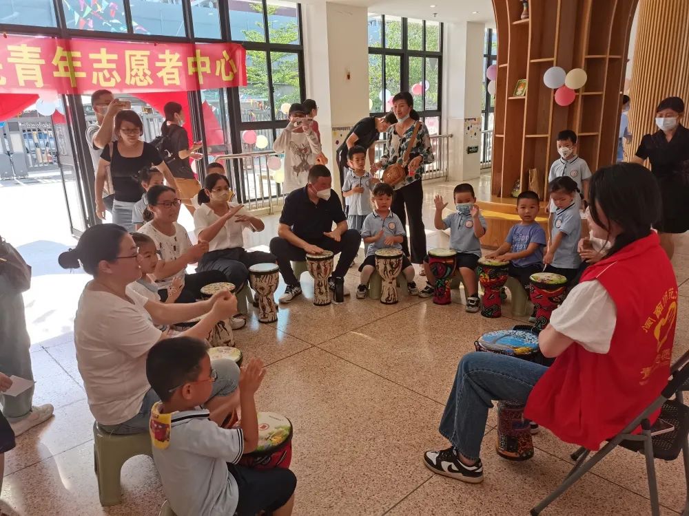 本次活动立足教育性、着眼趣味性、突出互动性,吸引了家长和小朋友一起参与体验,大家跟着主教志愿者一边哼唱歌曲,一边击打非洲鼓,现场热闹非凡,大家都表示意犹未尽。