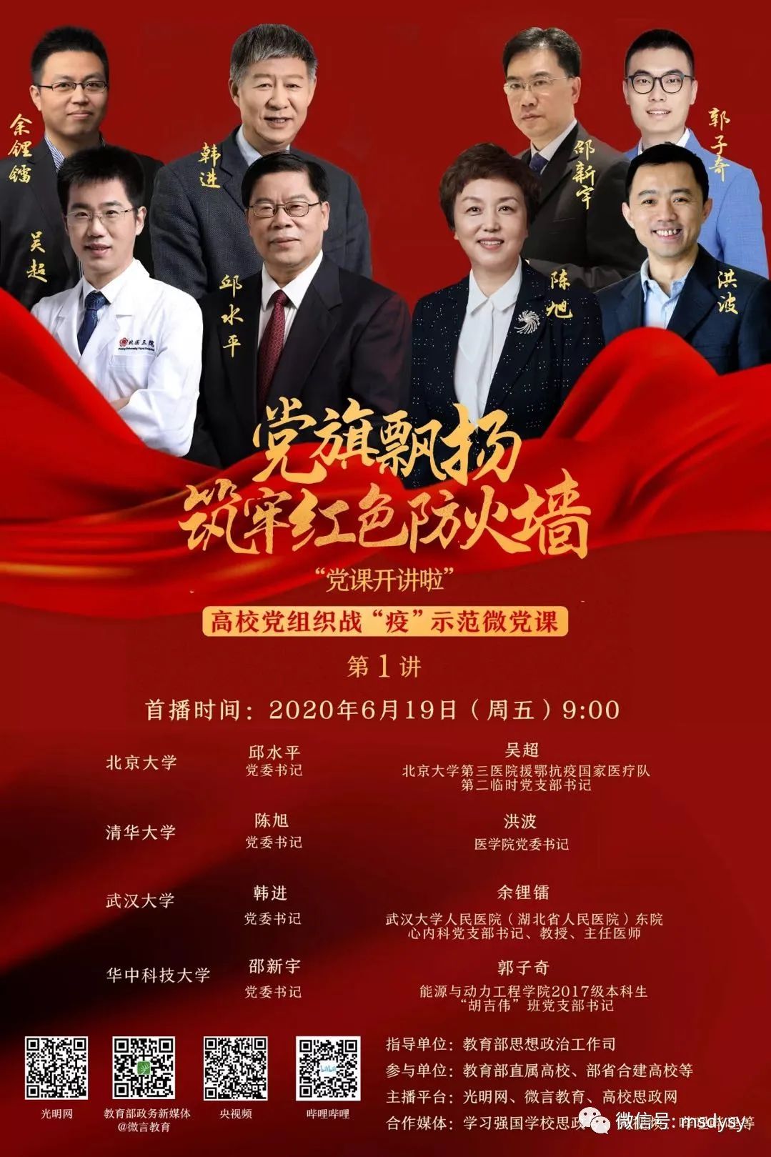2020年6月19日上午,学院党委组织党员师生利用网络线上一同观看由教育部主办的首场高校党组织战“疫”示范微党课——《党旗飘扬 筑牢红色防火墙》。本期示范微党课由北京大学、清华大学、武汉大学、华中科技大学4校党委书记和基层党组织书记以“1+1”形式联合开讲,旨在引领带动全国高校全面加强基层党建工作,让党旗始终高高飘扬在疫情防控、返校复学、事业发展全过程全方位。