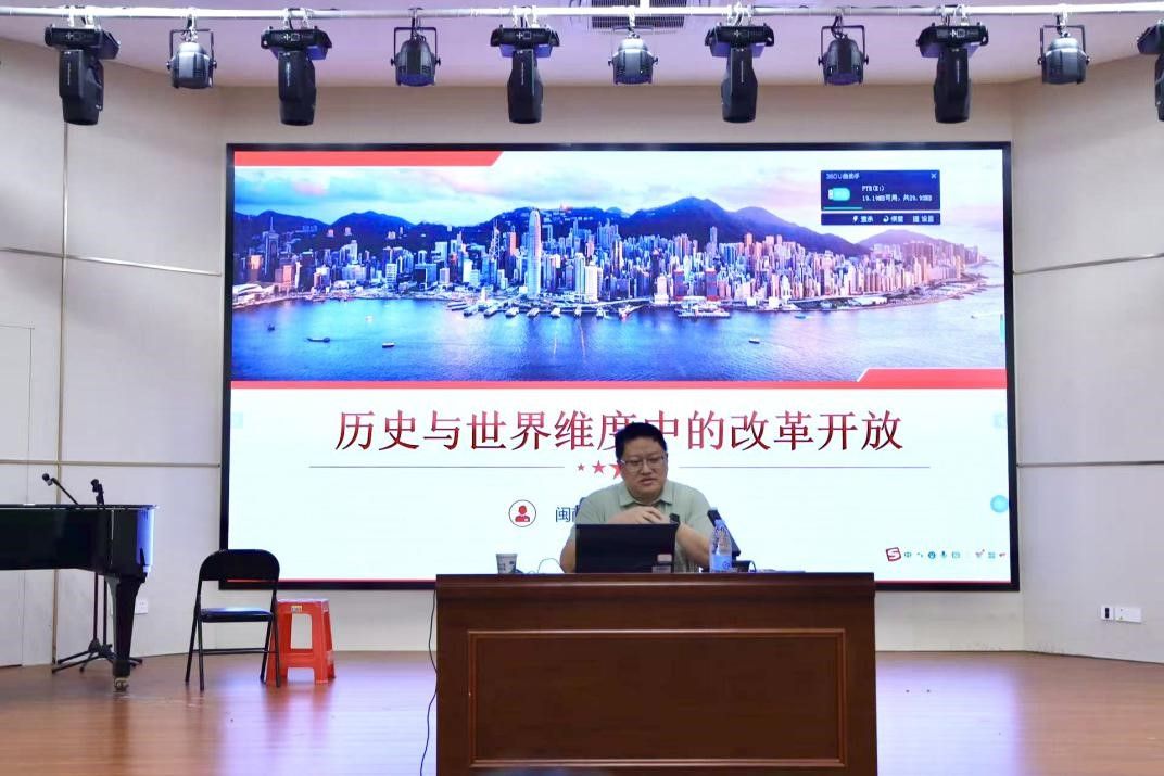 5月10日,金年会诚信信誉至上商学院党委书记周霖以《历史与世界维度中的改革开放》为题,深入剖析改革开放成功之因,解析了共产党员在制度创新与思想解放发挥的先锋模范作用。同时,周霖老师讲述了作为一名中共党员应该如何在新时代续写改革开放的伟大成就,为同学们指引前进方向。